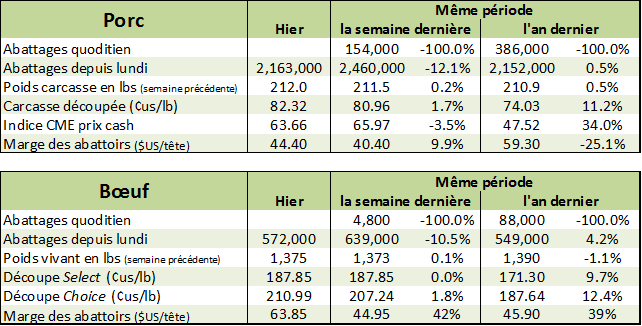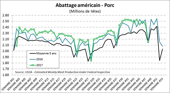 Les abattages de la semaine dernière étaient plus faibles qu’à la normale en raison de la Thanksgiving. Ils ont totalisé 572,000 têtes ce qui est 23,000 de plus (+4.2%) que la même période en 2016. Le poids continue de progresser, maintenant à 1375 lbs vivant ce qui représente un gain de 2 lbs (vivant et carcasse) versus la semaine précédente. La production était de 473.7 millions lbs, en hausse de 10.2 millions comparativement à l’an dernier.