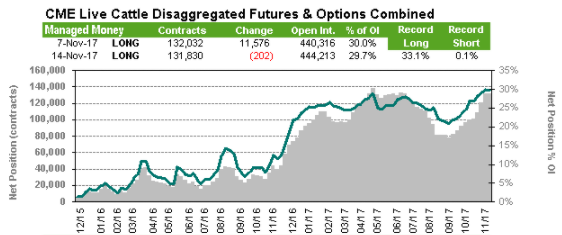 Entre le 8 et 14 novembre, les spéculateurs ont liquidé 5,000 contrats ce qui est relativement faible après les achats massifs des semaines précédentes. Au total, ils détiennent 73,233 contrats achetés, c’est historiquement élevé considérant que leur position a varié à l’intérieur de la fourchette de 10,000 à 80,000 contrats achetés au cours des 2 dernières années.