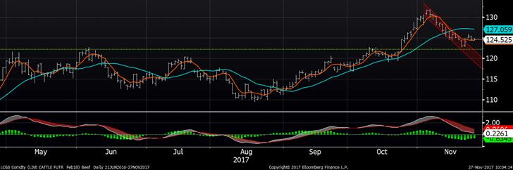 Le marché du bœuf se stabilise depuis quelques jours avec les contrats de décembre et février oscillant autour de 119 ¢ et 125 ¢/lb respectivement. Très peu de transactions sur le marché cash ont été rapportées la semaine dernière, définitivement affecté par le Thanksgiving. On s’attend tout de même à un léger recul puisqu’il n’y avait pas d’intérêt des acheteurs à 119 ¢/lb lors de l’encan électronique de mercredi. La valeur des découpes était mixte vendredi, avec un gain de +1.98 ¢/lb pour le Choice à 210.99¢, tandis que le Select perdait -0.79 ¢/lb à 187.85.