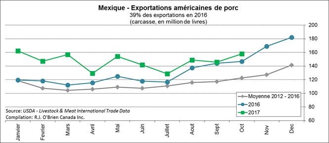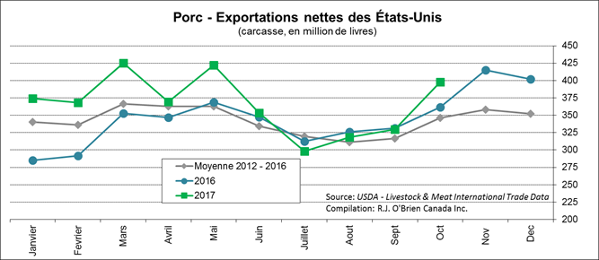 Ce matin, à 11h00, l’USDA publiait les exportations américaines de porc en octobre. Les exportations étaient particulièrement bonnes pour le Mexique, à 157.8 M lbs, c’est 11M lbs de plus que l’an dernier. Au total, les américains ont expédié 494.6 M lbs de porc, soit 43 M lbs de plus qu’en 2016. Pendant ce temps, les importations totalisaient 97 M lbs, dont le 2/3 provenait du Canada, ce qui donne des exportations nettes à 397.6 M lbs, en hausse de 10%. Il reste à voir si les ventes continueront d’être fortes jusqu’en décembre, comme ce fût le cas en 2016.