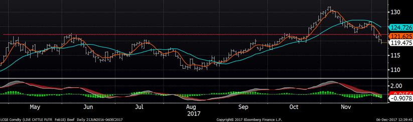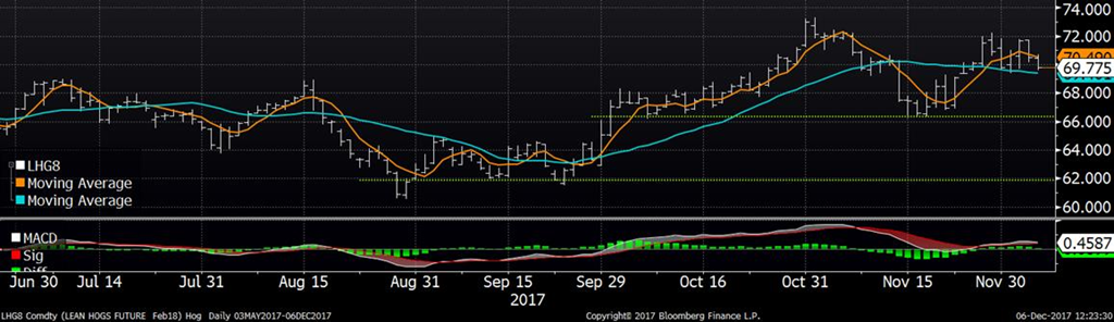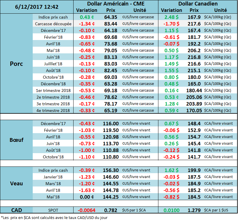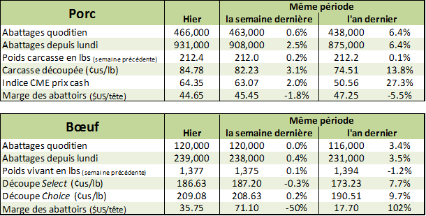 Hier, le prix du porc s’est contracté d’environ 1 ¢/lb sur l’ensemble des échéances au-delà de décembre en raison d’inquiétudes sur la production à venir. Les abattages de lundi et mardi totalisent 931,000 têtes ce qui est 5.9% de plus que l’an dernier. Les vendeurs craignent que la production s’ajuste éventuellement avec les estimés de l’USDA, mais encore une fois, il faudra attendre de voir les chiffres du weekend avant de sauter aux conclusions trop rapidement. Pendant ce temps, le marché cashcontinue de s’apprécier, à 65.10 ¢/lb pour mardi (+0.48), correspondant à un indice CME à 64.85 (+0.50) pour demain ce qui le met le contrat de décembre à rabais versus le cash. Il reste 7 publications de prix cash avant le règlement du contrat de décembre et historiquement, le prix cash monte de 1 ¢/lb en moyenne durant cette période… les risques que le contrat tombe sous la barre du 64 ¢/lb semblent faibles. De plus, le prix de la carcasse découpée continue de monter, à 84.78 ¢/lb (+0.84) pour la journée d’hier, principalement grâce à une augmentation de la valeur de l’épaule et du jambon. Aujourd’hui, le prix des contrats perdent ¾ ¢/lb à l’exception de décembre qui ne bouge pas.