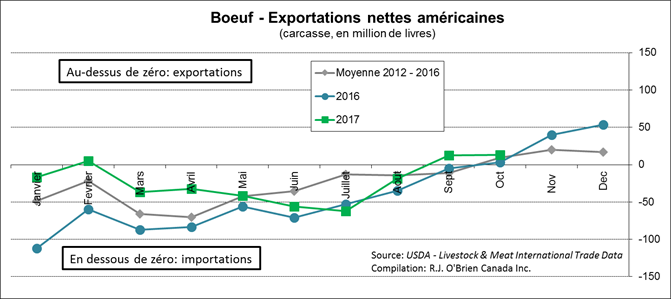 En octobre, les exportations de bœufs américains étaient de 260 millions lbs, principalement vers l’Asie (Japon, Hong-Kong et Corée du Sud). En contrepartie, les importations étaient de 246.6 millions lbs, en provenance de l’Australie, du Canada et du Mexique. Au net, il s’est exporté 13.35 millions lbs en octobre, ce qui est très près de la moyenne 5 ans ainsi que d’octobre 2016.