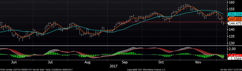 Le prix du bœuf a fini la journée d’hier à la baisse sous la pression de signaux techniques de vente. Autant les prix du bœuf que celui du veau d’embouche ont terminé la séance sous leur support technique, continuant la tendance baissière amorcée la semaine dernière. Ce matin, il n’y a pas eu de vente effectuée sur l’encan électronique.