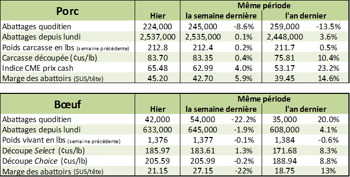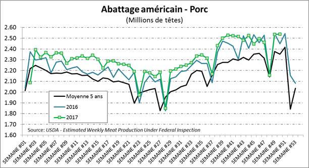 La semaine dernière, les abattages étaient de 633,000 têtes, en baisse de 1.9% par rapport la semaine précédente, mais en hausse de +4.1% versus l’an dernier. Le poids s’approche graduellement de ce qu’on a connu en 2016. Le poids était de 1376 lbs/vivant ou 833 lbs/carcasse, c’est seulement 5 lbs/carcasse de moins que l’an dernier (0.6%) alors que le poids fût en moyenne 1.6% supérieur cette année. En somme, la production était de 526.1 millions livres comparativement à 508.6 millions l’an dernier (+3.4%).