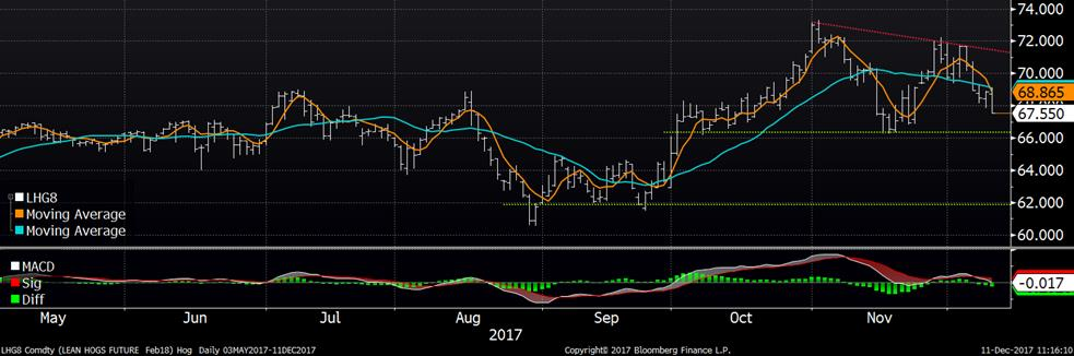 Le marché du porc a reculé la semaine dernière sous les appréhensions d’une baisse saisonnière de la valeur des découpes ainsi que des abattages volumineux. On est dans la période de l’année où les abattages atteignent leur sommet annuel, juste avant le temps de fêtes. C’est donc sans surprise que les abattages de la semaine dernière soient les plus volumineux de 2017 à 2.54 millions têtes et la deuxième plus grosse semaine historiquement. Toutefois, c’est la première fois depuis la fin octobre que la production hebdomadaire est significativement plus large que celle de l’an dernier à pareille date et le marché craint que les porcs « manquants » en novembre se retrouve en partie dans la production des prochaines semaines. Les abattages étaient 3.64% de plus que l’an dernier alors que le poids était 0.53% plus élevé à 212.85 lbs/carcasse, totalisant une production de 540 millions de livres, soit +4.19% vs la même semaine en 2016. L’augmentation du poids du porc maintient la cadence des dernières semaines à près de +0.5 lbs par semaine, il reste à voir si on ira rejoindre les sommets de l’automne 2015 à 214 lbs/carcasse. Entre le 29 novembre et le 5 décembre, les spéculateurs ont acheté un net de 4773 CàT ce qui augmente leur position d’achat à 68,300 CàT.