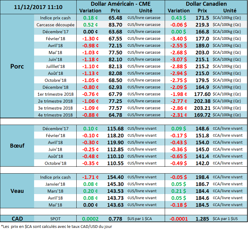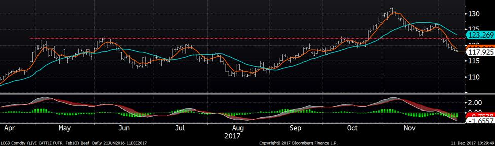 Le prix du bœuf ne parvient pas à sortir de la tendance baissière, en baisse pour une 8ème journée consécutive sur le contrat de février. Conséquemment, le prix de ce matin affiche un nouveau creux à 118 ¢/lb sur février. Cette pression négative provient en partie d’une faiblesse sur le prix cash ainsi que de la liquidation des spéculateurs qui détenait une énorme position d’acheteur. D’une part, le prix cash sur les plaines américaines était en baisse de 3 à 4 ¢us/lb la semaine dernière, à 117-118 ¢/lb. D’autre part, les spéculateurs ont liquidé 3,073 CàT entre le 29 novembre et 5 décembre, réduisant leur position d’achat à 117,000 CàT, mais cette position a fort possiblement continué à diminuer depuis, en raison de la tendance actuelle. Le seul facteur qui pourrait causer un revirement serait la météo qui s’annonce plus froide qu’à la normale pour les plaines américaines.