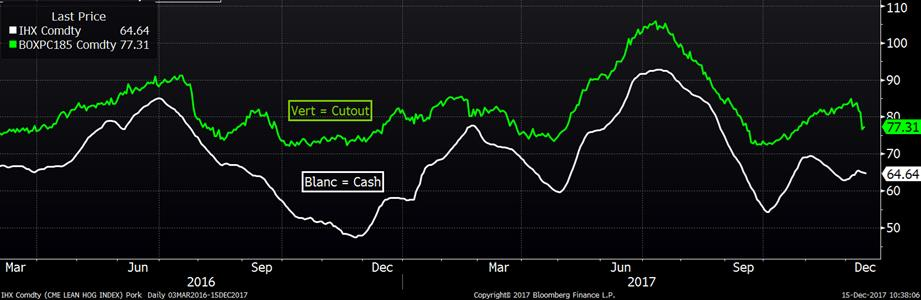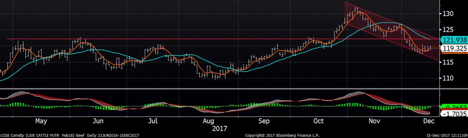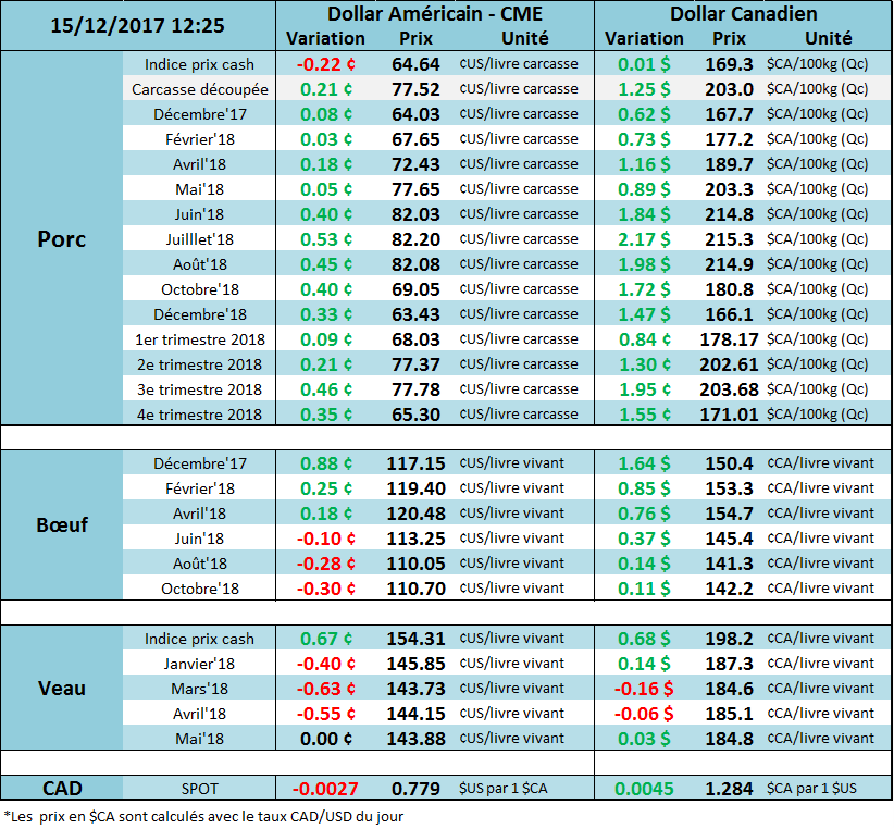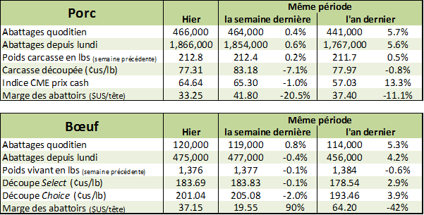 Cette semaine, le prix du bœuf a légèrement récupéré de sa dégringolade des deux derniers mois. Après avoir atteint un sommet à 132 ¢/lb au début novembre, le prix du CàT de février a perdu 14 ¢ avant de se stabiliser. Il n’y a pas eu beaucoup d’activité dans transaction cash cette semaine (signifiant que les prix étaient déjà fixés ou déterminés via une formule), il y a eu des offres d’achat à 116 ¢/lb qui n’ont pas trouvé preneurs, mais reste mieux que ceux de mercredi à 114-115 ¢/lb. Les parcs d’engraissement demandaient 119 ¢/lb vivant (ou 190¢ carcasse).
