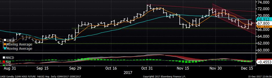 La semaine fût marquée par la chute du prix des jambons et du flanc de porc. Depuis vendredi dernier, le prix du jambon a perdu 16% à 56.64 ¢/lb et celui du bacon a perdu 24% à 108.34 ¢us/lb… ce sont des variations majeures pour quelques jours seulement! Évidemment, ces mouvements de prix des coupes causent un resserrement de la marge des abattoirs, en baisse de presque 10 $US/tête cette semaine, à 33 $US. De plus, les abattages s’enlignent vers une semaine record avec 1.87 millions porcs abattus en 4 jours, soit 0.6% de plus que la semaine précédente qui était la 2ème plus importante en abattage. Le fondamental n’est donc pas très positif en ce moment. Concernant l’analyse technique, on demeure dans la tendance baissière malgré le rebond du prix depuis hier midi, il reste à voir si le prix parviendra à rester au-dessus du support de 66.00 ¢/lb sur février et à sortir du canal baissier dans lequel le prix est emprisonné depuis le début décembre.