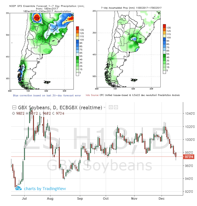 Soja : Le marché de météo est clairement amorcé pour les cultures sud-américaines. C’est très simpliste comme analyse (des fois il ne faut pas chercher trop loin non plus) mais si la météo est clémente au Brésil/Argentine le marché sera baissier. À l’inverse les prix pourraient s’apprécier. Jusqu’à maintenant les cultures au Brésil s’annonce fantastiques, c’est celles de l’Argentine qui inquiétaient. Mais la pluie est tombée et a entrainé les prix en même temps. Coté export, c’est comme le corn et le programme U.S est en retard…Précipitations Argentine :