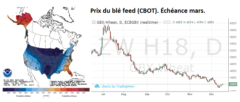 Blé : comme le montre la carte suivante, il va faire très froid et certains craignent pour la qualité. Par contre le blé est un marché (comme le maïs) en abondance et même si les cours ont monté marginalement, cela n’efface pas la chute de plus de 30% depuis juillet.
