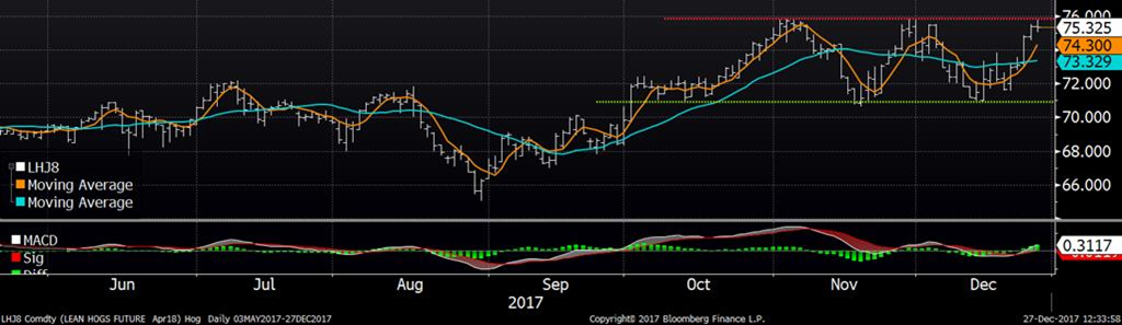 Après avoir diminué après la publication du Cattle-on-Feed de vendredi dernier, le prix des contrats de bœuf a rebondi hier. Malgré le fait qu’il y aura beaucoup de bœuf au 2ème trimestre, le prix du bœuf tente de sortir du canal baissier des 2 derniers mois. Une fermeture au-dessus de 122.50 ¢/lb sur février indiquerait que la tendance a réellement changé de direction, mais le marché se transige encore 1 ¢/lb en-dessous de ce niveau. La météo plus froide qu’à la normale pour l’est des États-Unis ainsi que des prévisions annonçant de la neige ces prochains jours sont des éléments qui viennent supporter le prix du bœuf à l’arrivé du nouvel an.