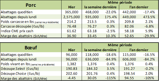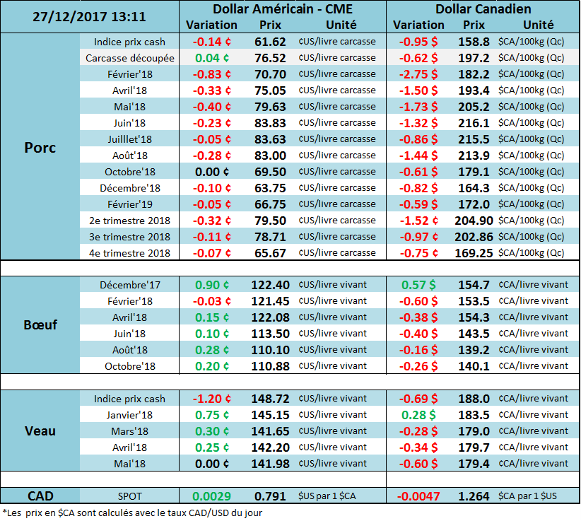 Il n’y a pas eu de vente sur l’encan électronique ce matin, malgré les 637 têtes offertes. Il y a quelques prix demandés qui ont été affichés dans le sud des plaines américaines à 122 – 125 ¢/lb, mais l’activité sur le marché comptant semble très faible durant la période des fêtes. On note que le poids des bêtes augmente moins rapidement que la tendance saisonnière et que le poids de la semaine dernière à 1382 lbs/vivant (837 lbs/carcasse) est similaire à ce qu’on avait l’an dernier tandis qu’il a été 1.5% plus élevé en moyenne en 2016. Cela vient atténuer l’effet des abattages plus élevés.