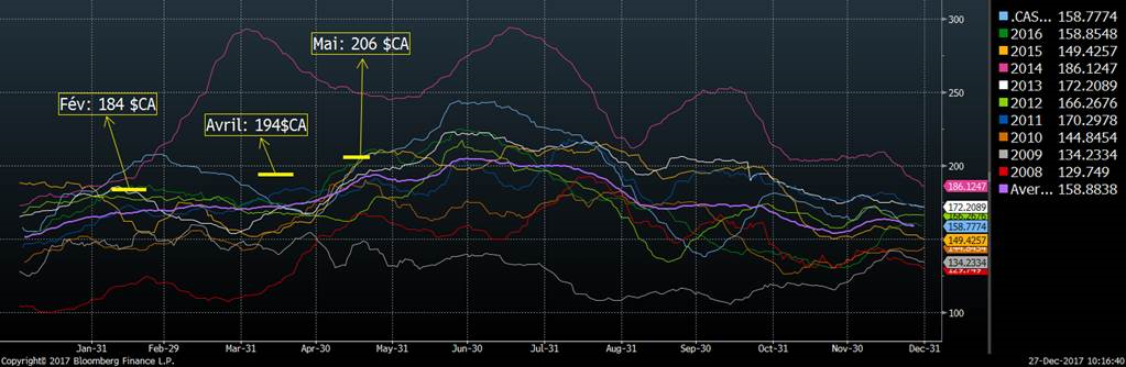 Après la publication du rapport trimestriel Hogs & Pigs, le marché a retrouvé une tendance haussière malgré que le cheptel reproducteur et de jeunes porcelets soient plus élevés qu’anticipés. Le rallie semble s’essouffler aujourd’hui après que les contrats d’avril et juin touchent leur résistance technique, soit 75.75 et 84.25 ¢/lb respectivement. Cela donnait des niveaux intéressants pour ajouter des protections, particulièrement sur avril qui était à 194 $CA/100kg en matinée. Comme vous pouvez voir sur le graphique saisonnier ci-dessous, c’est un prix historiquement élevé puisqu’à l’exception de 2014, le deuxième meilleur prix de la dernière décennie était en 2011 à 183 $CA/100kg et ensuite, c’est 174 $CA/100kg en 2016… la moyenne des 10 dernières années pour la mi-avril est de seulement 173 $CA/100kg, environ 20$ de moins que le prix actuellement disponible pour 2018.
