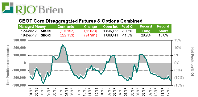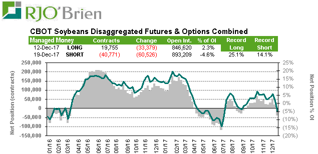 Le prix de la fève qui se maintenait cette nuit à cassé tôt ce matin et n’a jamais vraiment repris si bien que la hausse d’hier est à moitié effacée. J’ai vu passer des annonces d’exportations en Chine, mais rien d’anormal. Ce qui m’embête plus c’est de voir les spéculateurs vendre agressivement ; en deux semaines ils ont vendu pratiquement 100 milles contrats et complètement effacé leur position longue. Les contrats de janvier expirent bientôt, le premier jour de livraison est vendredi. Comme dans le corn, les spread sont bearish et suggèrent un inventaire plus que confortable pour les prochains mois. Les futures de juillet sont 33 cents plus élevé que le spot de janvier et je suspecte encore une fois que le hedging se fasse à partir du printemps afin de capturer le carry de 12$ la tonne.