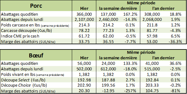 Pour la dernière semaine de 2017, les abattages de bœufs étaient de 502,000 têtes ce qui représente un recul de -2.5% comparativement à la même semaine en 2016. Le poids est de 1382 lbs/vivant (836 lbs/carcasse) ce qui est le même poids que l’an dernier tandis que le poids était en moyenne 1.5% de plus cette année qu’en 2016. Au total, la production de la semaine dernière était de 418.6 millions livres en baisse de 2.4% par rapport à la dernière semaine de 2016. En 2017, les abattages de bœufs auront totalisé 31.7 millions bêtes ce qui est 5.3% de plus qu’en 2016 alors que la production totalise 25.85 milliards lbs, en hausse de 3.8%. Pour le veau, les abattages étaient de 500,000 têtes en 2017, en hausse de 4.2%, mais en raison d’un poids plus faible, la production a reculé de -1.5% en 2017 à 72.6 millions livres.