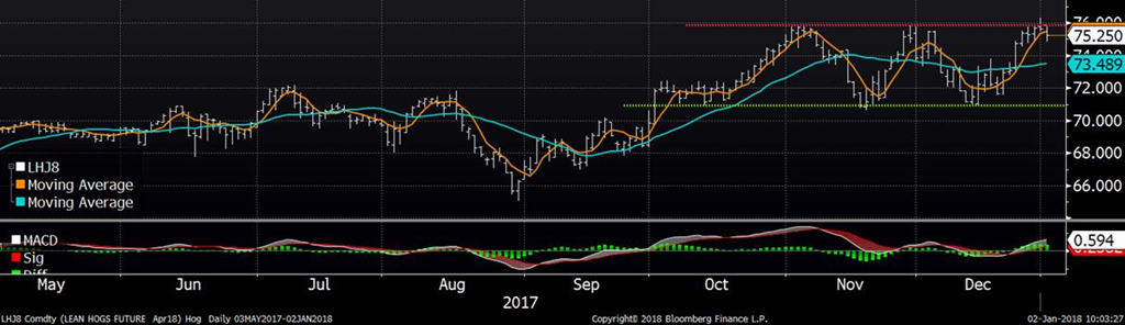 Après avoir atteint un nouveau sommet vendredi sur l’échéance d’avril à 76.325 ¢/lb, le prix avait faibli à la fermeture pour terminer dans le rouge. Cette tentative de percer la résistance (ligne rouge) a encore échoué ce qui favorise le scénario qu’avril restera entre 71.00 et 76.0 ¢/lb à court terme. Le prix a commencé l’année 2018 à la baisse d’une demie ¢/lb sur février, mais s’apprécie sur les mois d’été dont juin à 84.25 ¢/lb. Vendredi, le prix de la carcasse découpée continuait à monter avec un gain de +0.19 ¢/lb à 78.22 ¢/lb, principalement grâce au prix de la longe de porc.