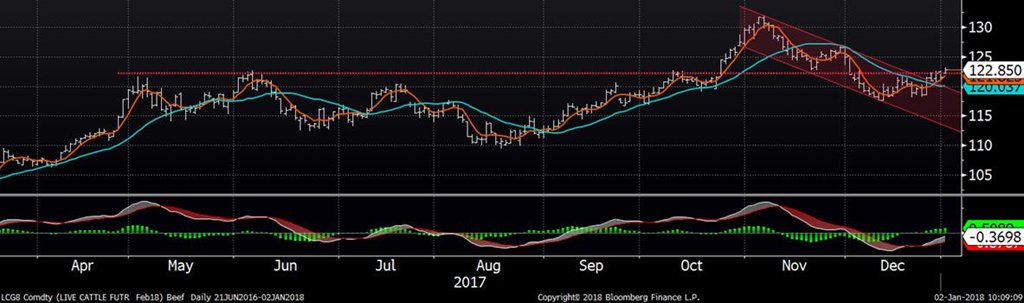Le prix du bœuf commence l’année positivement avec un gain de 1.30 – 1.50 ¢/lb dépendamment des échéances. Un prix de fermeture au-dessus de 123 ¢/lb sur février confirmerait qu’on sort de la tendance baissière des 2 derniers mois, à surveiller de près mais ce qui est encourageant est de voir certains indicateurs (moyennes mobiles et MACD) qui pointent déjà vers une hausse à court terme. Le rebond d’aujourd’hui s’explique en partie grâce aux prévisions météo qui continuent de prévoir une température froide et sèche pour les plaines américaines au cours de la prochaine semaine (le blé d’hiver gagne 2% et le gaz naturel monte de 3%).