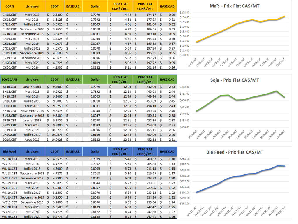 Blé: la vague de froid qu’on connait ici et aussi présente aux USA au moment où le couvert de neige n’est peut-être pas assez généreux. Le résultat des courses fait en sorte que le prix à la bourse a augmenté pour une autre journée consécutive. Le prix demeure relativement faible à 4.35 (CBOT mars) mais c’est tout de même un bon de 20 cents depuis la mi-décembre. Techniquement les courbes nous donnent certains indicateurs positifs pour le prix avec le croisement des moyennes mobiles, croisement MACD et aussi la sortie du canal baissier. Par contre ne vendez pas la peau de l’ours avant de l’avoir tué; je demeure très prudent d’un rallye météo à l’hiver…. Après tout c’est un blé d’hiver, en dormance, dans un contexte d’abondance et aussi, avant la parution des ensemencement/stock/WASDE de vendredi 12 janvier prochain. C’est un commencement de quelque chose, mais restons réaliste car la structures du marché via le carry (différence de prix entre mars et mai par exemple) montre un inventaire extrêmement confortable.