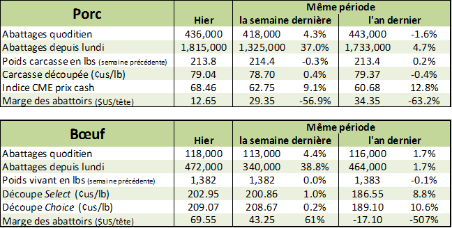 Le prix du porc a connu une sévère correction depuis mercredi avec une chute de 2.5 et 3¢/lb sur les échéances de février et avril respectivement. D’une part, la production s’avère très élevée cette semaine avec des abattages quotidiens au-dessus de 460,000 porcs pour les 3 premiers jours de la semaine. En date de jeudi soir, les abattages étaient presque 5% plus élevé que l’an dernier et c’est sans parler du poids qui continue d’être élevé. Cette énorme production met de la pression sur la valeur des découpes contrairement au marché cash qui monte rapidement. En effet, le prix cash s’apprécie de +1 ¢/lb par jour ces derniers jours, l’indice CME est publié à 68.46 ¢/lb ce matin comparativement à 62.75¢ il y a une semaine. De la sorte, la marge des abattoirs s’est rapidement contractée, passant de 29 $US/tête à 12.7 $US en l’espace d’une semaine. S’il la demande n’augmente pas à court terme pour faire augmenter la valeur des découpes, on croit que la contraction des marges des abattoirs amènera le prix cash à plafonner prochaine.