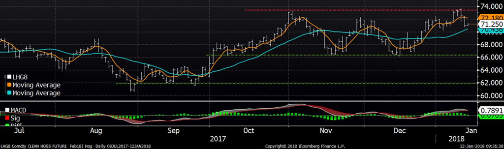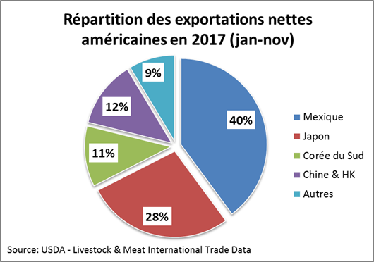 D’autre part, le Canada a annoncé mercredi après-midi qu’il perçoit les probabilités augmenter que Trump se retire de l’ALENA. Inévitablement, l’annonce avait fait chuter le dollar canadien mercredi, mais le marché du porc a également subi une pression négative. Considérant l’importance de la relation États-Unis / Mexique pour le marché du porc américain, les éleveurs se sont possiblement précipités pour vendre une portion de leur production à la bourse afin de sécuriser leur revenu appréhendant une possible baisse du prix si les dires du Canada se réalisent. Il faut dire que la production pour la première moitié de 2018 s’annonce très élevée, une petite baisse des ventes vers le Mexique pourrait avoir une répercussion majeure sur le prix américain. En 2017, le Mexique a acheté l’équivalent de 40% des exportations nettes des États-Unis avec une moyenne de 149 millions lbs par mois.
