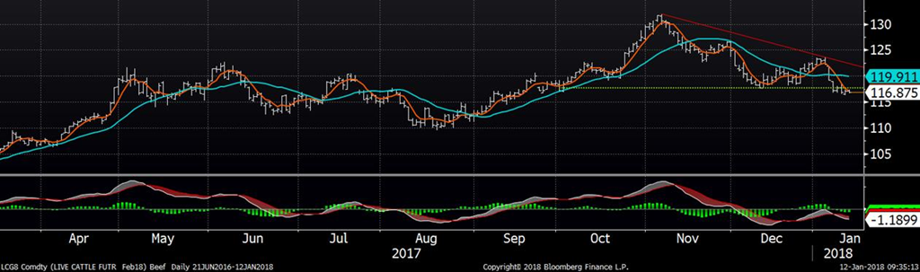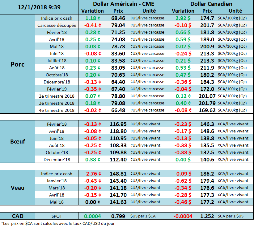 Cette semaine, le prix du bœuf à Chicago est faible, touchant son plus bas niveau en 4 mois sur l’échéance de février. Cette faiblesse indique que les anticipations du prix cash sont négatives puisque le prix de février est historiquement plus élevé que lecash à cette période de l’année. Cette semaine, les transactions cash se situaient entre 118 et 120 ¢/lb ce qui est cohérent avec l’encan électronique de mercredi où 401 bêtes ont été vendus à un prix moyen de 119¢. L’effet de la nouvelle sur l’ALENA (voir commentaire porc) est mitigé sur le marché du bœuf puisque la quantité de bœuf qui est exporté au Mexique et Canada est moindre que ce que les États-Unis achètent de ces 2 voisins. En moyenne en 2017, les États-Unis achetaient au net 50 millions lbs par mois du Canada et Mexique.