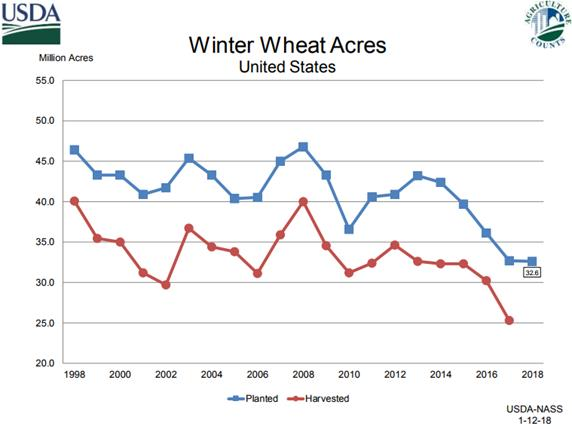 Contrairement à la fève et au maïs on connaissant déjà les récoltes 2017 et ils n’étaient pas question de modifié rendement et surfaces. Ce que je surveillais le plus aujourd’hui était 1) les semis et 2) les stocks. Dans les deux cas l’information est bearish pour les prix. La surprise a été une superficie de blé d’hiver plus élevé que prévu. Alors que le marché prévoyait un autre recul des surfaces de 1 à 2 millions d’acres, les cultivateurs américains maintiennent quasiment les même acrages que l’an dernier. C’est un peu étonnant étant donné du prix faible, des inventaires encore très élevé et la difficulté incroyable à exporter les surplus. En fait le problème d’export est similaire pour le grain en général dans le sens ou ce n’est pas la consommation mondiale qui est faible, mais c’est bien que la production n’est plus uniquement l’affaires des USA. Aujourd’hui la Russie et les pays de l’ex URSS produisent le triple, oui trois fois plus, que la production américaine. Ils ont un avantage clair compte tenu de la proximité des grands consommateurs comme l’Égypte et de leur monnaie favorable. Il y a un exode des céréales aux USA; le blé est partie en Russie et la fève plie bagage pour le Brésil.