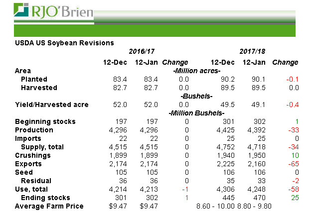 Coté production c’est comme le maïs; certaines petites modifications mais sommes toutes rien de majeur. Le rendement a été revu à la baisse de 0.4 bpa ce qui fait chuter la production 2017 à 4.392 milliard. Dans le cas de la fève c’est plutôt les chiffres de la demande qui m’intéressait et je trouve les révisions très cohérentes. La trituration roule vite donc on a augmenté de 10 millions mais c’est surtout l’export qui s’est fait redresser le portrait avec un ajustement de -65 millions de boisseaux. C’était inévitable. Le programme d’export est en sérieux retard par rapport aux cibles visées du ministère et l’USDA était en devoir de rajuster le tir. En plus les productions sud-américaines vont très bien; au Brésil on augmente de 2 millions de tonnes et en Argentine un réduit un peu de 1 million de tonnes. La demande est bonne, les importations de la Chine sont en croissance c’est simplement que la compétition internationale est très forte. Les chinois s’approvisionnent de plus en plus au Brésil et de moins en moins aux USA, en proportion. En fait, le retard du programme d’exportation est un problème de près de 150 millions de boisseaux mais c’est trop tôt pour que l’USDA coupe autant. Gardez en tête que s’il n’y a pas un rebond dans les exportations U.S., il se pourrait fort bien qu’on réduire encore dans les prochains bilans.