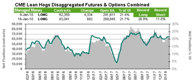 La pause du Martin Luther King Day a été très bénéfique pour le prix du bœuf avec un rebond de plus de 5¢/lb depuis. Après peu de volume sur le marché cash, les offres d’achat ont subitement apparus à la hausse sur les plaines américaines à 123-123 ¢/lb comparativement à seulement 118 ¢ la semaine précédente. Un élément qui vient supporter les prix est les prévisions du rapport Cattle-on-Feed de vendredi, lequel sera publié seulement si le shutdown du gouvernement américain est terminé. En raison des placements élevés des derniers mois, les analystes pensent que les placements de décembre auront été plus faibles qu’en 2016. La moyenne des estimés est à -3.1% pour les placements et -1.4% pour la commercialisation, résultant à un inventaire en parc à 7.7% de plus que l’an dernier. Notez qu’il y avait 1 jour ouvrable de moins en décembre 2017 qu’en 2016, ça explique en partie les diminutions des placements et des sorties.