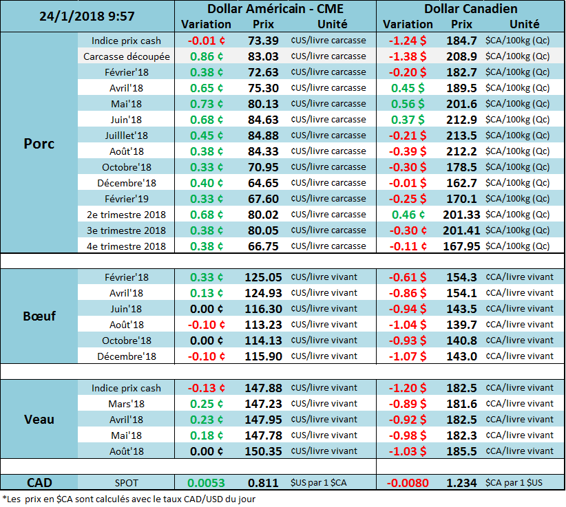 Le prix cash de lundi est retourné dans la zone positive grâce à un gain de 0.44 ¢ (publié hier) avec une moyenne à 73.69 ¢/lb. Néanmoins, le volume répertorié pour le calcul du cash était près du 2/3 de ce qu’on a normalement, il faut donc prendre cette publication avec un peu de recul puisque les chiffres semblent avoir été impactés par le shutdown du gouvernement américain, lequel a pris fin lundi en après-midi. Le marché manque présentement de direction dans un contexte où l’anticipation de l’augmentation de la production est contrebalancée par une forte demande qui soutient le prix des découpes. Hier encore, le prix des découpes a gagné près de +1% à 83.03 ¢/lb, à son plus haut niveau en 6 semaines. Il faut dire que les abattages des 2 derniers jours roulent un peu au ralenti et aident à l’appréciation des découpes. En effet, les abattages totalisent 851,000 têtes ce qui est -2.0% comparativement à l’an dernier. Ce retard s’explique par la tempête de neige aux États-Unis, mais l’effet sur les prix devraient être éphémère.