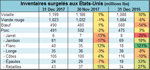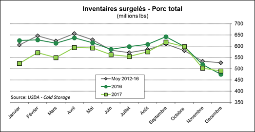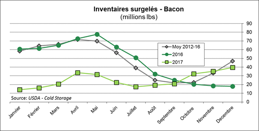 Le ministère de l’agriculture américain (USDA) rapportait qu’il y avait 491 millions de livres de porc en inventaires surgelés à la fin de décembre, 3.2% de plus que l’an dernier, mais tout de même 6.7% moins que la moyenne des 5 dernières années. Possiblement que les exportations de porc ont été modestes en décembre, expliquant la faible diminution des stocks. Normalement, les inventaires de porc diminuent en décembre à mesure que les détaillants utilisent leurs inventaires en vue de la période des fêtes. Notamment, les besoins de la période des fêtes de l’an dernier et les excellentes exportations avaient été responsables du déclin de 8% versus novembre 2016, mais cela ne s’est pas reproduit en décembre 2017. Les inventaires de cette année ne sont inférieurs que de 2.3% versus novembre, pas autant que l’an dernier, mais tout de même bien en avance sur la moyenne des 5 dernières années. Nous sommes neutres sur le niveau global des inventaires de porc. Le bacon est en hausse, 120% plus haut que le niveau le plus bas atteint en 2017. Les inventaires de bacon suivent davantage les mouvements saisonniers habituels et devraient maintenir une pression sur les prix, évitant de reproduire ce qui s’est produit l’an dernier.