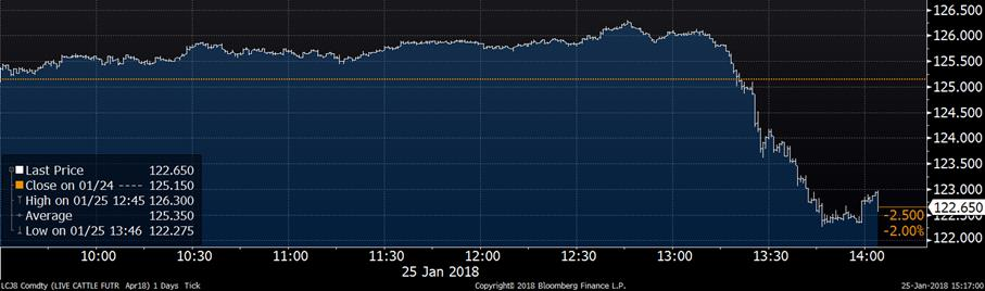 Cependant, lorsque les traders sont revenus du lunch, le marché s’est mis a baissé rapidement, cumulant une chute de -3.5 ¢/lb entre 13h15 et 13h45, avant de s’écraser sur la limite baissière quotidienne (limit down). La chute est survenue en même temps que Trump évoquait une fois de plus la possibilité de déchirer l’ALENA en raison des faibles progrès durant la 6ème ronde de négociation qui se passe présentement à Montreal. Puisque le Canada et le Mexique sont des importants acteurs dans l’industrie du bœuf américain, les commentaires de Trump pourraient être une explication plausible quant à la chute du prix observée cette après-midi.