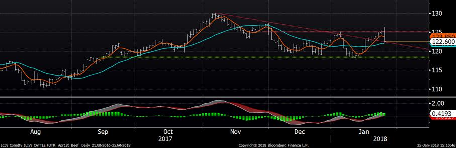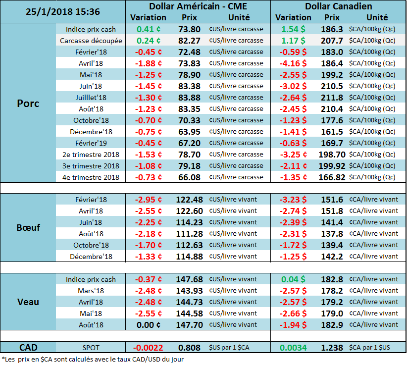 Le prix du porc continue à jouer au yo-yo, retournant dans le bas du dernier mois. Il faut dire que les abattages de mercredi, à 465 000 têtes, rappel au marché l’abondance de viande porcine qui est prévue pour les prochains mois. Cela a aussi pesé sur les prix des découpes d’hier qui baissaient de -1.00 ¢/lb. Le prix repose présentement sur un petit support à 74.00 ¢/lb sur avril, mais si ce support est brisé, une chute jusqu’à 71.00 ¢ deviendrait possible. De plus, les menaces de Trump face à l’ALENA dans son discours à Davos en début d’après-midi remet un spectre sur les relations États-Unis / Mexique qui demeurent très importantes pour la valeur du porc.
