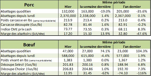 Les abattages de bœuf étaient relativement faibles la semaine dernière, perturbés par la tempête en début de semaine. Le volume hebdomadaire était de 588,000 bœufs, soit 4.4% de moins que la semaine précédente, mais toujours au-dessus des quantités de l’an dernier par 1.2%. Le poids demeure stable depuis plusieurs semaines autour de 1383 lbs/vivant (836 lbs/carcasse) ce qui représente 2.0% de plus que l’an dernier à pareille date. La production était de 490 millions lbs, soit 4.6% de moins que la semaine dernière mais 3.3% de plus qu’il y a 1 an.
