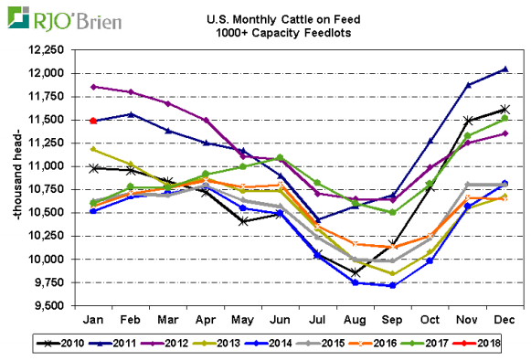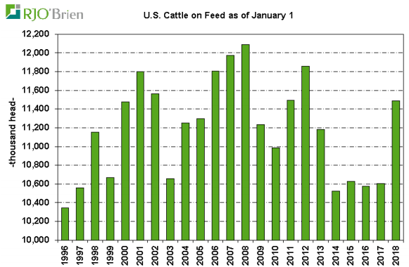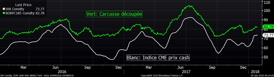 L’USDA a publié le rapport Cattle-on-Feed après la fermeture de vendredi. Le rapport est négatif pour le prix puisque les inventaires de bœufs en parc au 1er janvier étaient 0.5% de plus qu’anticipé à 108.3% du cheptel du 1er janvier 2017, à 11.49 millions têtes. La fourchette des estimés était de 107.2% à 108.1%, le résultat est donc au-dessus des prévisions de tous les analystes. Alors que les analystes prévoyaient un recul des placements en raison du fort volume à l’automne dernier, les placements de décembre continuent d’être plus élevés que l’an dernier, par 0.8%, comparativement à la fourchette des prévisions de -6.7% à +0.3%. Concernant les sorties des parcs, c’est en ligne avec les prévisions, en baisse de 1.4% versus décembre 2016. À la lumière des derniers rapports, on note qu’il y aura une forte production vers les mois d’avril et juin étant donné la somme des placements des 3 derniers mois est 12.4% plus élevé que l’an dernier, alors que le nombre de bœufs qui sont en parc depuis plus de 90 jours est en croissance de seulement 2.8% ce qui devrait être neutre pour le prix de février.