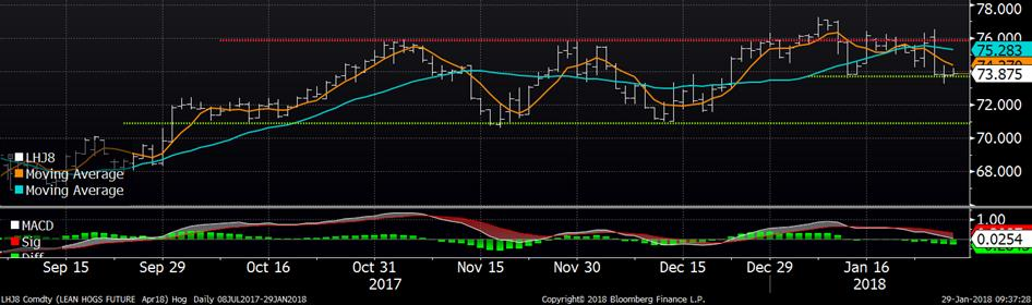 Sans tendance claire sur le prix cash du porc, le prix du CàT d’avril continuait de varier entre 74.00 et 76.00 ¢ la semaine dernière. On a notamment terminé la semaine sur le support technique de 74.00 ¢/lb, si jamais le prix brise ce niveau, la porte serait ouverte pour une chute jusqu’à 71.00 ¢/lb qui correspond aux bas d’octobre, novembre et décembre. Ce matin, le prix a ouvert très légèrement à la hausse.