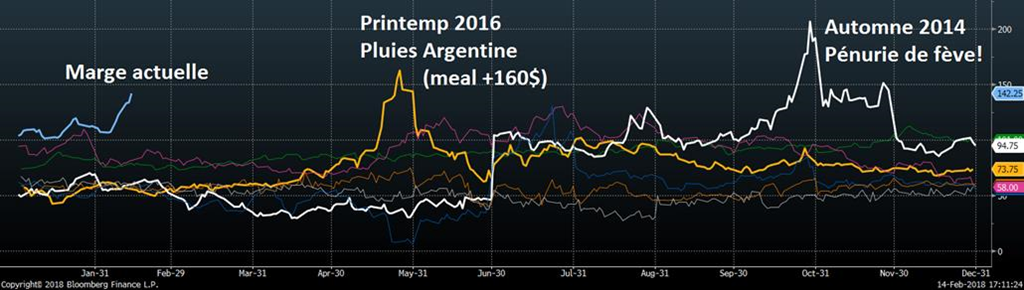 Les marges de trituration sont actuellement très élevées. À un niveau record pour la période de l’année…. Le « crush margin » c’est un calcul simple ou on achète la fève soja et revend les sous-produits de tourteau et d’huile…. La différence entre les achats et le ventes me donne la marge. Naturellement plus les marges sont élevées, plus les usines veulent transformer. La récente hausse de prix du tourteau a fait en sorte de faire grimper les marges à un niveau très élevé! Les américains qui ont un stock de fève très imposant, le plus élevé depuis bien des années seront réjoui par cette belle hausse de rentabilité qui vient de l’Amérique du Sud. L’Argentine aux prises avec un climat de sécheresse qui fera baisser la récolte a envoyé le prix du tourteau dans la stratosphère. Je m’attends à voir les USA augmenter significativement le crush (surveillez le prochain rapport NOPA) pour aller capturer ces marges bien juteuses. L’impact sera de réduire les inventaires U.S de fève afin de produire le tourteau pour le marché international. Est-ce que cela veut dire que le prix du tourteau va redescendre? Peut-être, mais pas nécessairement tout de suite car on ne connait pas encore l’impact de la sécheresse sur la récolte en Argentine. Éventuellement les marges de trituration chuteront, mais c’est difficile de prévoir exactement quand ou de quelle manière car les marges peuvent aussi bien réduire par une baisse de tourteau ou une hausse de la fève. Le fait qu’il y a abondance de fève aux US et Brésil me laisse présager qu’un l’ajustement se fera via le tourteau. À suivre.
