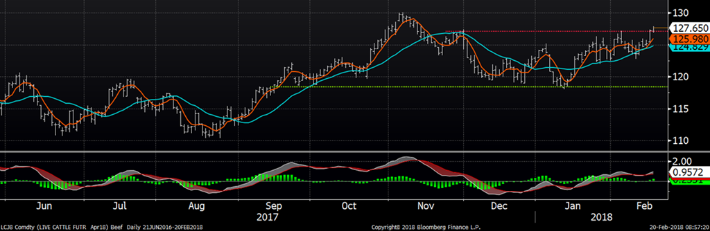 Le prix du boeuf a terminé la semaine dernière en force avec un nouveau sommet sur le prix d'avril depuis la mi-novembre. De plus, le prix du contrat d'avril a percé la résistance ce qui ouvre la porte jusqu'au prochain sommet à 130 ¢/lb. C'est le sentiment de voir une demande plus robuste qui supporte le prix. D'une part, le prix des découpes remontent avec le Selectà 205 ¢/lb, un sommet en 7.5 mois, alors que le Choice retourne près du haut des derniers mois à 210 ¢/lb. D'autre part, la marge des abattoirs s'améliore ce qui laisse présager que les abattoirs pourront enchérir sur leur mise puisqu'il y avait peu de transaction la semaine dernière étant donnée que les parcs d'engraissement demandaient 130-132 ¢/lb. Toutefois, la marge des abattoirs demeure négative à -3$US ce qui est tout de même mieux que la semaine dernière à -25$US/tête et l'an dernier à -60$US/tête.