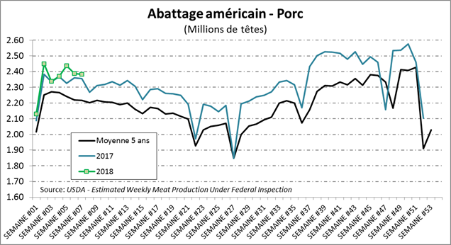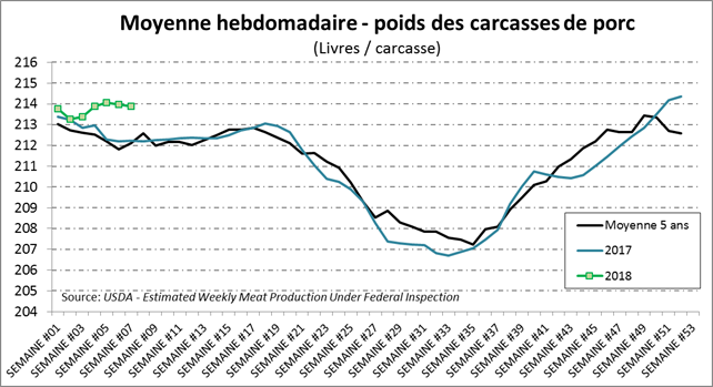 La semaine dernière, les abattages de porc étaient de 2.38 millions têtes ce qui est en ligne avec la semaine précédente et 1.2% supérieur à l’an dernier. C’est tout de même moins élevé que ce qu’on s’attend en milieu de semaine alors que les abattages roulaient à 5% de plus de l’an dernier. Le poids demeure très haut à presque 214 lbs/carcasse, c’est 1.5 livre de plus que l’an dernier et la moyenne quinquennale. En somme, la production hebdomadaire de porc étaient de 510 millionslbs aux États-Unis, c’est 10 millions lbs de plus que l’an dernier (+2.0%), en ligne avec l’augmentation observée depuis le début 2018 (+2.1%). À moins que le rapport Hogs and Pigs de décembre surestime l’inventaire de porc, il faudrait s’attendre à des chiffres de production plus élevés dans les prochaines semaines.