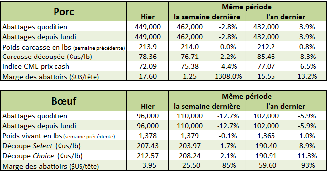 La semaine dernière, les abattages de bœuf aux États-Unis étaient à 596,000 têtes ce qui est légèrement au-dessus de la semaine précédente, mais 3.5% de plus qu’il y a un an. Le poids des bêtes reste stable à 1378 lbs vivant ou 828 lbs carcasse, on maintient donc le gain de +1.0% versus l’an dernier. La production hebdomadaire s’établissait à 492 millions lbs ce qui représente une augmentation de 4.3% par rapport la même semaine en 2017.