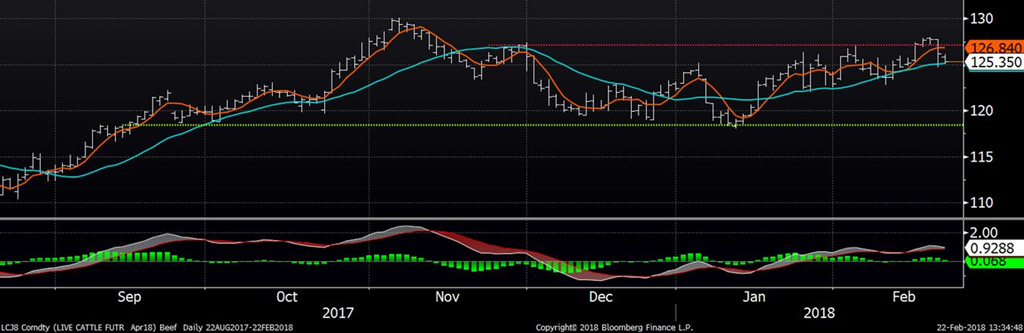 La chute d’hier pourrait être le premier signe que le marché est en train de former un sommet. Le marché devra absorber une offre massive dans les prochains mois. Le rapport Cattle-on-Feed pourrait être une bonne façon de se rappeler de cette abondance. La demande a été particulièrement forte cette année, absorbant 3 à 4% de plus de production que l’an dernier. Au même moment, les prix du bœuf sont en hausse de 11.7% par rapport à 2017. Selon un sondage de Reuters, les négociants s’attendent en moyenne à un placement à 100.4% de l’an dernier (de 97.7% à 102.9%). Les ventes sont attendues à 106% et ceci amènerait l’inventaire de bœuf en parc d’engraissement à 107.4% de l’an dernier. Pour le rapport sur les inventaires surgelés, on s’attend à des inventaires de 495 million de livres ce qui sera publié après la fermeture du marché d’aujourd’hui.