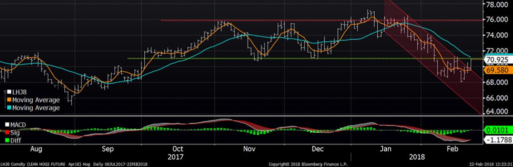 Le marché du porc s’apprécie cette semaine grâce à des anticipations d’une forte demande puisque la valeur des découpes remonte. Le CàT d’avril a gagné près de 3¢/lb cette semaine et on est de retour à la résistance technique de 71 ¢/lb (ligne rouge). On constate toutefois que le prix est sorti du canal baissier et que l’indicateur MACD n’est plus rendu négatif. Les marges des abattoirs demeurent fortes dû aux récents bonds de la carcasse découpée ce qui supporte le prix cash à court terme. Le prix des découpes étaient de 78.73 hier, en baisse de -0.99 ¢ par rapport à mardi, mais en hausse comparativement à 76.46¢ la semaine dernière. Le marché a fermé en hausse hier, notamment sur les échéances d’été, et ça se poursuit aujourd’hui.
