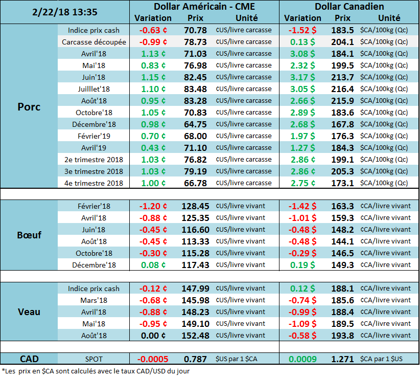 Le poids moyen en Iowa/Minnesota pour la semaine du 17 février a clôturé à 285.1 lb versus 284.9 lb la semaine dernière et 281.3 lb l’an dernier. Le poids moyen demeure bien au-delà de la moyenne des 5 dernières années, ce qui constitue un facteur négatif pour le prix. L’USDA estime que les abattages étaient de 460 000 têtes hier, amenant le total pour la semaine à 1.339 million de têtes. Il s’agit d’une baisse comparativement à la semaine passée (1.388 million de têtes), mais tout de même supérieur au niveau de l’an dernier (1.319 million de têtes). Les négociants s’attendent à des inventaires surgelés de porc de 550 million de livre pour le rapport mensuel qui sera publié aujourd’hui à 15h00.