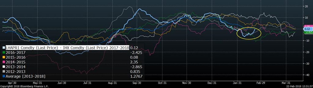 L’indice du prix cash CME sera de 70.17¢ demain matin, en baisse de 4¢ versus la semaine dernière. Donc, contrairement au marché boursier, le prix cash est sur une tendance baissière. Il faut dire que le prix d’avril était beaucoup plus faible que le prix cash il y a 2 semaines, atteignant un escompte de 6.8 ¢/lb versus le cash… Le marché appréhendait fortement la baisse du cash. Avec le rebond qu’on observe sur le contrat d’avril, on revient à une situation « normale » avec le cash et le prix d’avril au même niveau aujourd’hui. À partir de maintenant, pour s’attendre à voir d’autres hausses sur le marché boursier, il faudra que la baisse du cash ralentisse, autrement le prix d’avril devrait subir à nouveau de la pression négative. De plus, les fondamentaux à court terme pour le prix cash ne regardent pas bien à moins que la demande soit exceptionnellement bonne au cours des prochaines semaines. L’offre est encore en hausse par rapport à l’an dernier : le poids carcasse est plus élevé que la moyenne et les abattages continuent d’être supérieurs. De plus, l’ajustement saisonnier à la baisse entre le 1eret le 2e trimestre sera plus faible qu’à la normale ce qui pourrait nuire au rebond naturel du prix cash au printemps. Depuis 10 ans, la production de porc diminue en moyenne de 300 millions livres entre le 1er et le 2ème trimestre de l’année, jouant dans une fourchette de 236M à 430M lbs depuis 10 ans. Présentement, l’USDA prévoit une baisse de seulement 155 millions lbs entre les deux trimestres et c’est précisément le 2ème trimestre qui devrait connaître une abondance de porc avec 5% de plus que l’an dernier (sans parler du 12% plus de bœuf que l’an dernier).