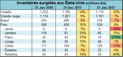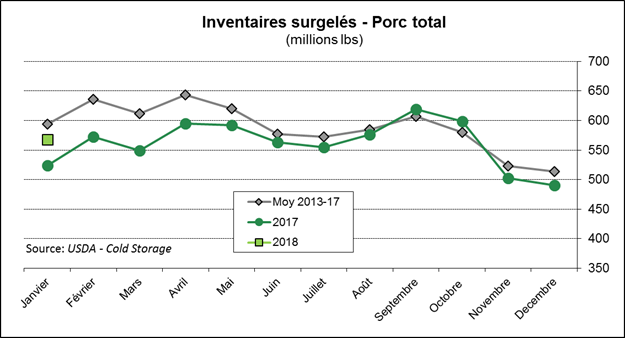 - Inventaires surgelés de porc à 568 M lbs, soit 16% et 8% de plus qu’en décembre et l’an dernier respectivement