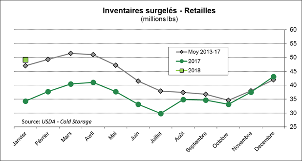- Inventaires de volaille à 1252 M lbs, en hausse de 4% et 12% comparativement à décembre et l’an dernier respectivement