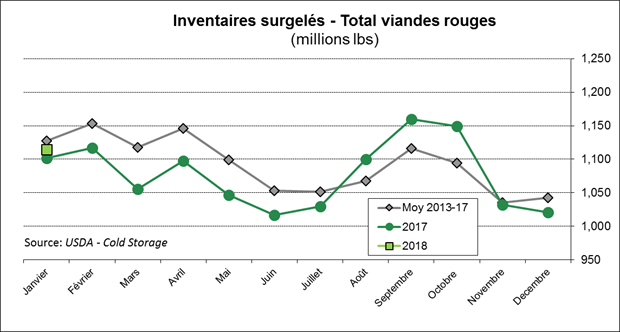 - Inventaires surgelés de bœuf à 500 M lbs, soit 2% de plus qu’en décembre mais 7% de moins que l’an dernier