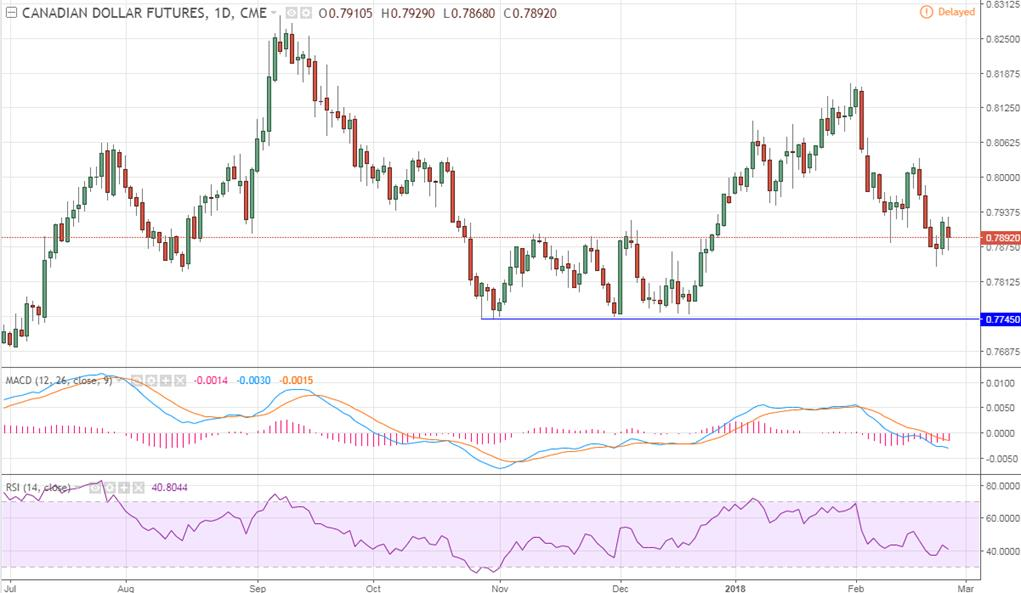 Le dollar canadien se maintient sous la barre des 79 cents US. Les supports sont à 77.45 sur les bas du dernier trimestre 2017. Les indicateurs techniques ne m’indiquent pas de renversement bullish mais je surveille le RSI proche de la zone sur-vendue ainsi que les divergences MACD.