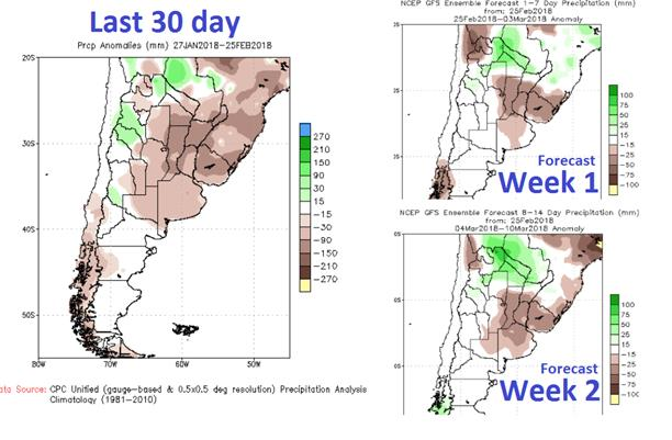 Les pluies en Argentine ont été encore une fois décevantes en fin de semaine. Depuis un mois la pluie tombe au compte goute et peu de nuage sont dans les radars. La sécheresse en Argentine est bien réelle et les rendements seront plus faible c’est année c’est presque garanti. L’USDA est encore beaucoup trop optimiste selon moi dans son évaluation de la récolte de fève soja à 54 million de tonnes. Les prévisions étaient à 57MMT en décembre puis on graduellement baissé à 54MMT mais les analystes s’attendent à une production possiblement plus autour de 46MMT. Encore là c’est incertain et cela dépend de la météo mais il faut s’attendre à une récolte beaucoup plus faible. Je pense que c’est raisonnable à ce stade-ci d’utiliser une production de 10MMT plus faible qu’en décembre… quelque chose autour de 46-47MMT me semble raisonnable. Maintenant est-ce que cela va être un peu plus un peu moins le temps le diras mais au moins on peut compter sur les surplus aux USA ainsi que la forte production Brésilienne pour compenser la plus faible récolte à Buenos Aires.