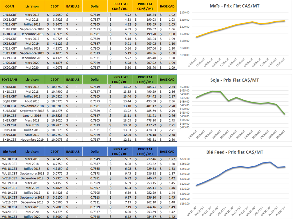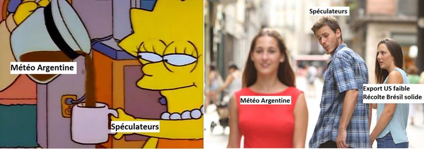 Nos sources s’attendent à une production de fève autour de 45 millions de tonnes comparativement à 57MMT en début d’année. On parle donc d’une baisse de 20% des rendements et l’USDA devra s’ajuster dans le prochain rapport. Évidemment les farmers argentin ne sont pas différents des autres sur la planète et ont mis un frein total sur la mise en marché ne savant pas combien/comment ils vont récolter cette année. Les utilisateurs ont bidder fort la semaine dernière pour ajuster leur approvisionnement mais on voit une pause cette semaine. On s’attend à voir les cultivateurs être plus agressif sur la commercialisation de maïs pour tenter d’entreposer la fève à la récolte. Rappelez-vous qu’il y a des tarifs douaniers à l’exportation pour la fève et non pour le maïs Les fonds de spéculation ont déjà amassé une solide position longue et ils surveillent de très près la météo.