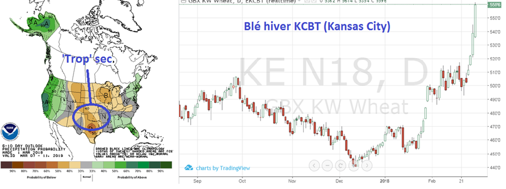 Le marché du blé a connu une hausse plus importante alors que les fonds continuent de couvrir les shorts à Chicago tout en construisant des positions longues à KC, car les cartes météorologiques restent très sèches pour les régions de blé d’hiver au cours des 10 prochains jours. La carte mise à jour de la sécheresse aux États-Unis montre aujourd'hui la sécheresse croissante dans les zones du sud-ouest des États-Unis (voir ci-dessous). Le blé Mpls continuera également à attirer plus d'acres ce printemps.